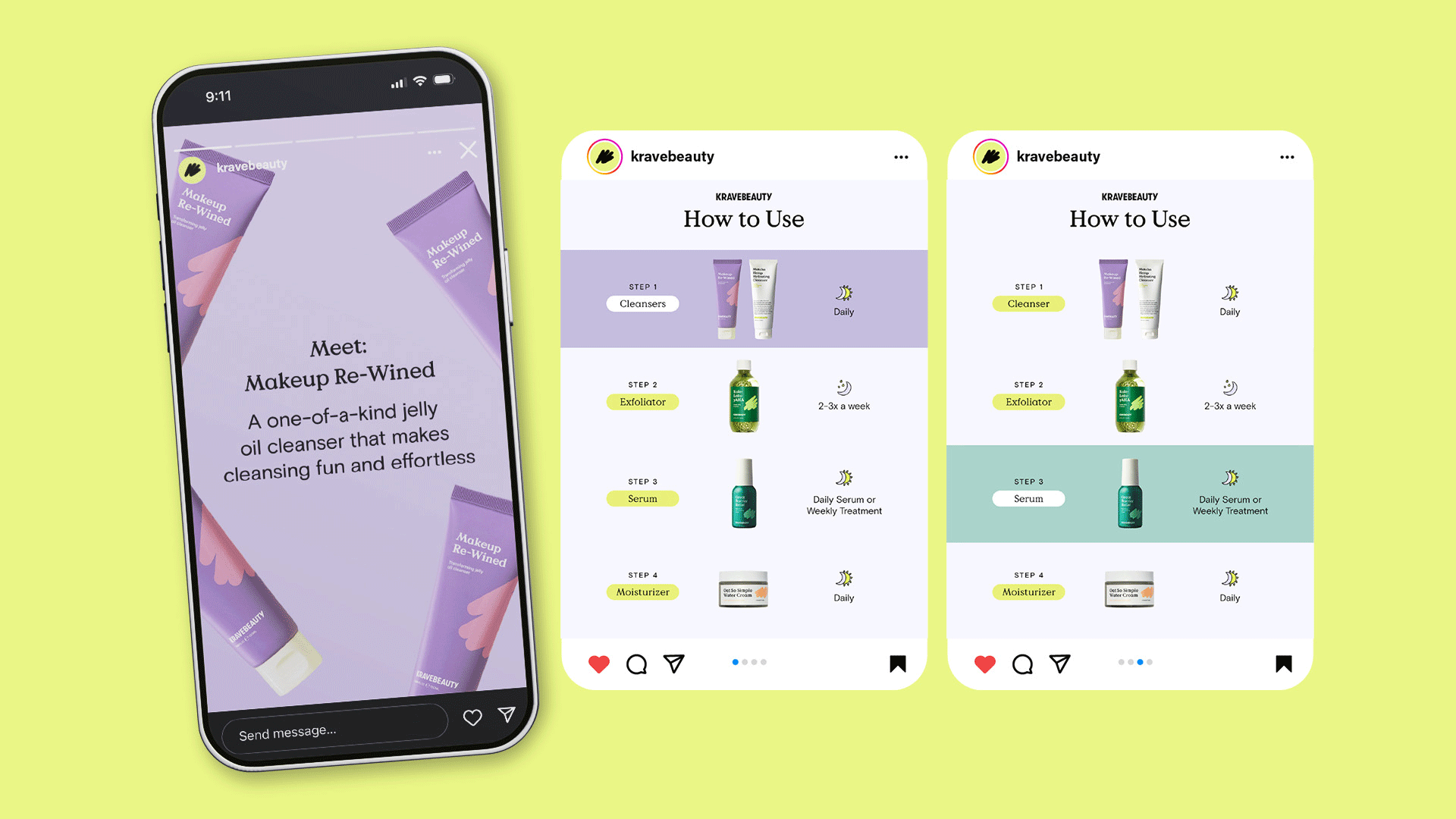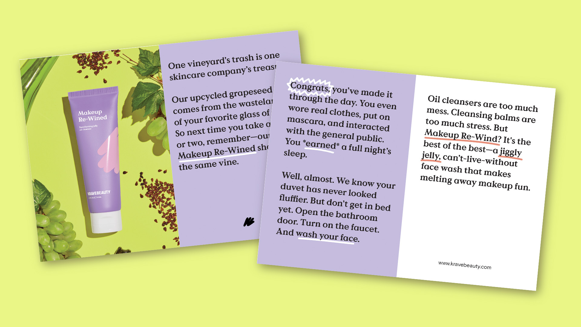 ︎ kravebeauty, designA collection of work that I created for the release of Makeup Re-Wined- a jelly based facial cleanser made from recycled grapes. The project spans across site graphics, email flows and newsletters, social media content, Youtube graphics, and packaging