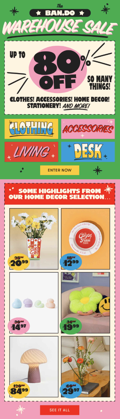 A big part of the brand philosophy at ban.do is inspiring joy in others. My job was to bring that to life visuall through marketing material- from site graphics, emails, social media ads, and printed media.Campaigns